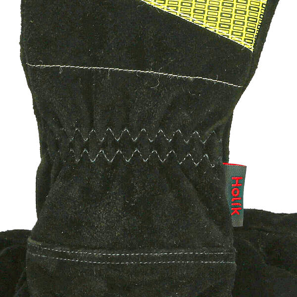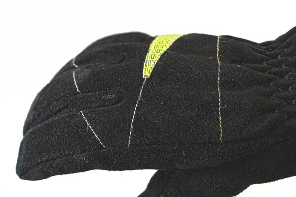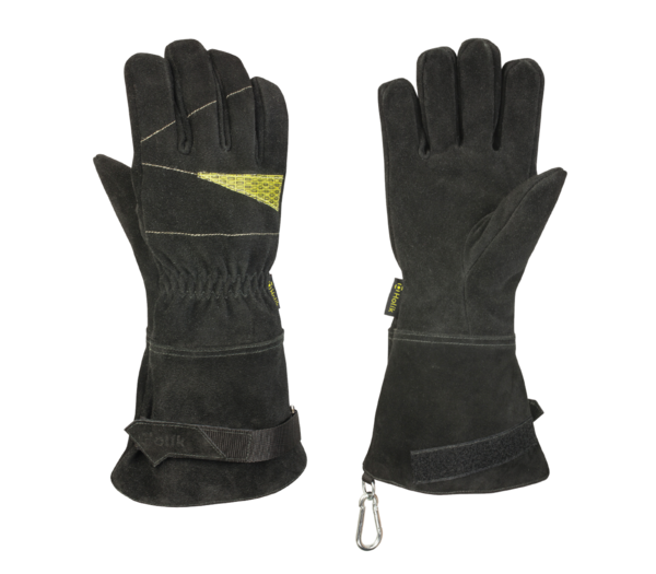 Zásahové rukavice z hovězinové štípenky. Mezi hlavní přednosti štípenkové usně patří vysoká odolnost vůči mechanickému opotřebení.